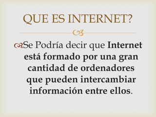 Para conectarse a Internet se necesitan varios elementos como un terminal (ordenador, teléfono, etc.), una conexión (línea telefónica, cable, etc.), un módem, un proveedor de acceso y un navegador. Internet permite el intercambio de información entre ordenadores de todo el mundo de forma universal, fácil de usar y económica. Los servicios más populares son la web, el correo electrónico, los chats, foros, blogs y redes sociales.