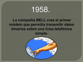 La creación del primer módem en 1958 permitió transmitir datos binarios por teléfono. Investigaciones en el MIT y ARPA condujeron al desarrollo de la conmutación de paquetes y la idea de una red global de computadoras. En 1969, 4 universidades se conectaron, marcando el inicio de ARPANET, precursora de Internet.