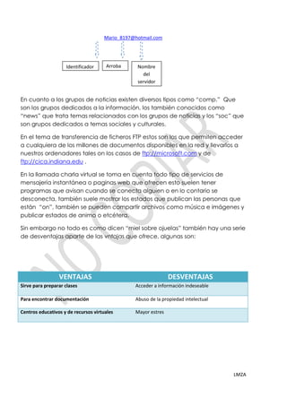 El documento describe el internet y sus principales características. Explica que el internet es un conjunto de redes interconectadas que permite acceder a una gran variedad de información y servicios como páginas web, correo electrónico y redes sociales. Se necesitan elementos como ordenadores, modem y navegador para conectarse. También menciona protocolos como HTTP y URL que permiten la correcta navegación entre sitios web.