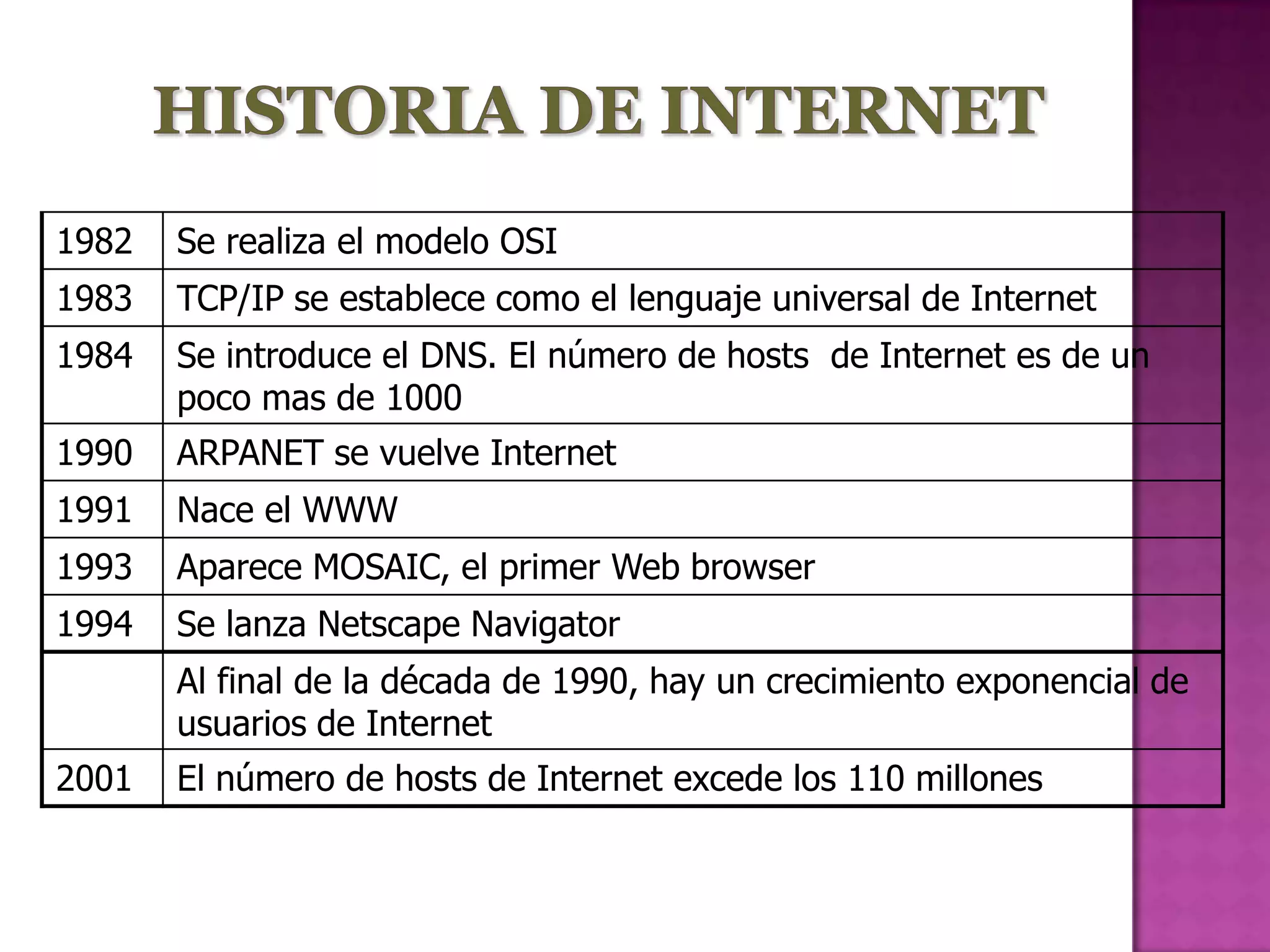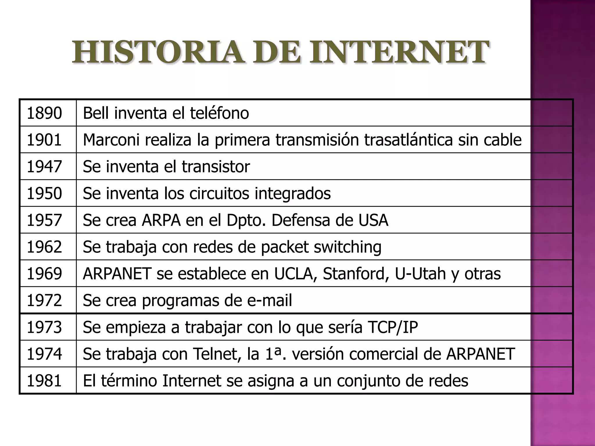 El documento resume los principales hitos en el desarrollo de Internet desde 1890 hasta 2001. En 3 oraciones: Comenzó con la invención del teléfono en 1890 y las primeras transmisiones inalámbricas a principios del siglo XX. ARPANET se estableció en 1969 conectando 4 universidades y dio paso a Internet. Para 2001 Internet tenía más de 110 millones de hosts conectados a nivel mundial.