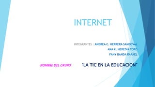 Internet es una red descentralizada de redes interconectadas que utilizan protocolos TCP/IP para formar una red global. Sus objetivos incluyen compartir recursos entre usuarios, proporcionar alta fiabilidad a través de fuentes alternativas, y ahorrar costos. Ofrece servicios como transferencia de archivos, correo electrónico, grupos de noticias, chats, y navegación web a través de navegadores. Está compuesta de terminales de usuario, módems, proveedores de acceso, y una conexión a Internet.