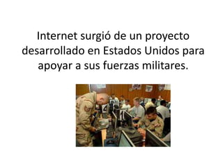 Internet surgió originalmente como un proyecto militar estadounidense llamado ARPANET que conectaba algunas computadoras. ARPANET evolucionó para incluir diferentes tipos de redes y se convirtió en el precursor de Internet, permitiendo la transferencia de archivos entre computadoras de manera independiente de su ubicación geográfica a través de una arquitectura de red abierta. Internet fue utilizado inicialmente por el gobierno y universidades antes de su adopción más amplia.
