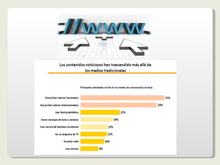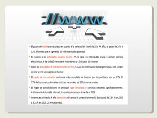 El documento resume los hábitos de los usuarios de Internet en México. Más del 70% de los hogares mexicanos tienen computadora e Internet. Los navegadores más populares son Chrome y Firefox, aunque Explorer aún mantiene el primer lugar. La mayoría de usuarios son hombres entre 12-17 años. Las redes sociales más recomendadas son Facebook, YouTube y Twitter, y se accede a ellas principalmente desde el hogar varias veces al día.
