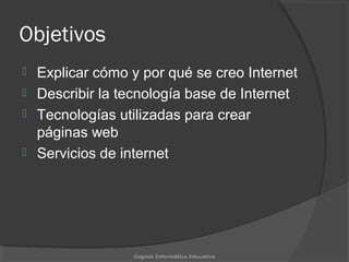 El documento explica la historia y tecnología de Internet. Comenzó como ARPANET, una red creada por el Departamento de Defensa de EE.UU. en 1969. Internet utiliza el protocolo TCP/IP y una arquitectura cliente-servidor. Ofrece servicios como correo electrónico, la World Wide Web, motores de búsqueda y FTP. El DNS traduce nombres de dominio a direcciones IP para facilitar la navegación.