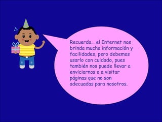 El documento describe el Internet como una red de ordenadores conectados que brinda acceso a información y entretenimiento, pero requiere uso cuidadoso para evitar riesgos como la adicción o contenido inapropiado. Ofrece beneficios educativos y laborales al dar acceso a bibliotecas y enciclopedias virtuales, así como entretenimiento a través de juegos, pero también presenta riesgos de adicción y contenido violento o pornográfico no adecuado para los jóvenes.