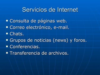Este documento resume varios servicios de Internet como el correo electrónico, los chats, los grupos de noticias y foros, las conferencias, la transferencia de archivos, y la comunicación colectiva a través de listas de correo, foros y grupos de noticias. También describe brevemente las ventajas e inconvenientes de las videoconferencias, las comunidades virtuales, la mensajería instantánea, y las páginas wiki. Finalmente, pide completar ejercicios relacionados con estos temas.