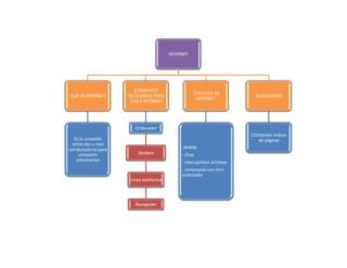 Internet es una red global que conecta computadoras y permite compartir información. Se necesita una computadora, modem, línea telefónica y navegador. Los servicios principales de Internet incluyen el World Wide Web, chat, intercambio de archivos y conexión a otras computadoras. Los buscadores contienen índices de páginas web para encontrar información en Internet.