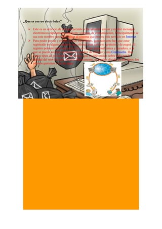 Internet es una red global de computadoras que comparten información a través de direcciones IP. Una de las primeras conexiones entre computadoras fue ARPANET, que conectó universidades en California y Utah. Actualmente, Internet incluye aproximadamente 5,000 redes en todo el mundo que usan protocolos como TCP/IP. El correo electrónico permite a los usuarios enviar y recibir mensajes rápidamente a través de sistemas de comunicación de Internet. Existen tres tipos de buscadores: índices de búsqueda, motores de búsqueda y metabus