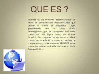Internet es una red mundial descentralizada de redes interconectadas que usan protocolos TCP/IP para funcionar como una sola red lógica. Se originó en 1969 con la conexión entre universidades en California y Utah como parte de ARPANET. Proporciona ventajas como comprar de tiendas internacionales, mejor comunicación y actualizaciones de computadoras, pero también desventajas como distracción en el trabajo, dependencia excesiva y problemas como spam, malware y virus.