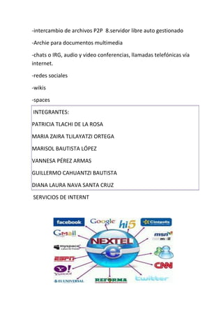 Internet es un medio de comunicación global que ofrece varios servicios principales como el correo electrónico, los foros, la web y las redes sociales. Estos servicios son herramientas esenciales para compartir información y comunicarse. Internet también apoya la educación a través de recursos como blogs, wikis y espacios de colaboración.