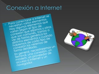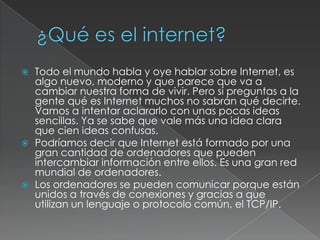 Este documento proporciona una introducción básica a Internet. Explica que Internet está formado por una gran red mundial de ordenadores interconectados que pueden compartir información utilizando protocolos comunes como TCP/IP. Señala que los servicios más populares de Internet son la World Wide Web y el correo electrónico, y que se necesita un navegador web como Internet Explorer, Firefox o Google Chrome para acceder e interactuar con la información en la Web.