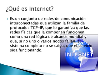 Este documento describe la comunicación y sociedad a través de Internet. Explica que Internet es una red global de redes interconectadas que usan el protocolo TCP/IP para garantizar la conectividad a pesar de fallas en nodos individuales. También describe el protocolo HTTP que permite el acceso a páginas web y otros medios de transmisión como correo electrónico, mensajería instantánea y telefonía por Internet. Finalmente, explica los diferentes tipos de archivos que se pueden descargar por Internet como música, videos, texto, hojas de cálculo