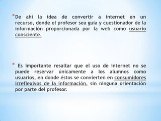 El documento explica que los docentes deben utilizar recursos didácticos novedosos como Internet debido al avance de la tecnología. Define un recurso como una fuente que produce un beneficio, y señala que Internet se puede convertir en una herramienta didáctica gracias a sus posibilidades informativas y comunicativas siempre que el profesor guíe a los estudiantes y cuestione la información en la web. Además, destaca los beneficios de Internet como contribuir al desarrollo de habilidades de alfabetización tecnoló