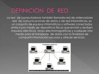 Una red de computadoras es un conjunto de equipos informáticos y software conectados entre sí para compartir información y recursos. Se compone de redes descentralizadas interconectadas que utilizan protocolos como TCP/IP para funcionar como una red lógica a nivel mundial. Sus orígenes se remontan a 1969 con la creación de ARPANET para conectar universidades en Estados Unidos.