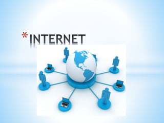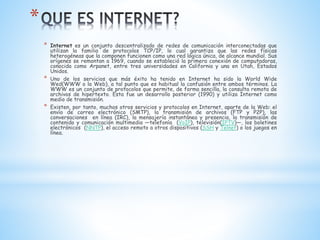 Internet es una red descentralizada de redes interconectadas que usan protocolos TCP/IP para funcionar como una red lógica global. Sus orígenes se remontan a 1969 con la conexión de computadoras entre universidades en EE.UU. La World Wide Web (WWW), desarrollada en 1990, utiliza Internet para transmitir hipertextos de forma sencilla. Existen otros servicios además de la WWW, como correo electrónico, transferencia de archivos, mensajería instantánea y contenido multimedia.