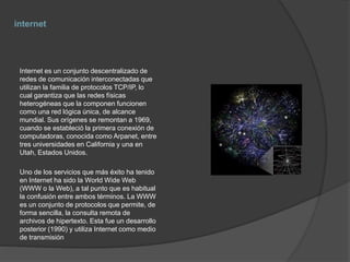 El documento habla sobre Internet y sus orígenes, describiendo que es una red descentralizada de redes interconectadas que utilizan protocolos TCP/IP. Explica que la World Wide Web es un servicio exitoso de Internet que permite consultar archivos de hipertexto de forma remota. También menciona que la WWW es un desarrollo posterior a Internet que usa esta red como medio de transmisión.