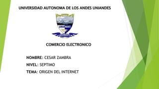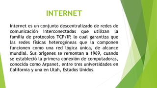El documento describe los orígenes e historia del Internet. Se remonta a 1969 cuando se estableció la primera conexión entre universidades en California y Utah, conocida como ARPANET. En los años siguientes se desarrollaron nuevos protocolos como TCP/IP para permitir la interconexión de redes de forma transparente y surgió el nombre "Internet". El uso moderno del Internet permite acceder a casi cualquier lugar a través de dispositivos móviles y ofrece servicios como correo electrónico y la web de forma más flexible.