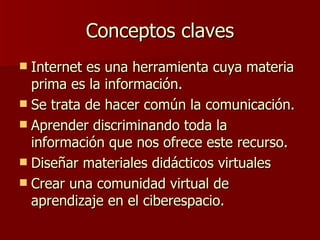 El documento describe las posibilidades educativas de Internet para una nueva enseñanza centrada en el alumno, el conocimiento y la evaluación. Internet puede usarse como una herramienta para la información y comunicación que permite a los estudiantes aprender de forma autónoma a través de materiales didácticos virtuales y comunidades de aprendizaje en línea, mientras que los profesores adoptan nuevos roles de orientación y evaluación.