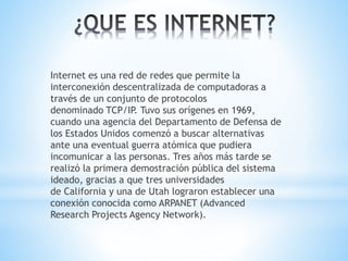 Internet comenzó en 1969 como una red descentralizada de computadoras llamada ARPANET, desarrollada por el Departamento de Defensa de EE.UU. para garantizar la comunicación en caso de guerra. En 1972 se realizó la primera demostración pública de ARPANET. Más tarde, la adopción del protocolo TCP/IP permitió interconectar otras redes, dando origen a lo que hoy conocemos como Internet.
