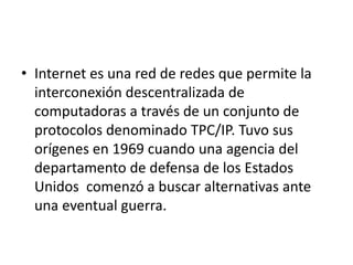 Internet comenzó en 1969 como una red descentralizada creada por el departamento de defensa de EE.UU. para garantizar la comunicación en caso de guerra, y en 1972 se realizó la primera demostración pública de ARPANET, la red precursora de Internet, que conectó universidades en California y Utah.