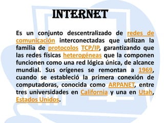 Internet es una red descentralizada de redes interconectadas que utiliza la familia de protocolos TCP/IP para funcionar como una red lógica única a nivel mundial. Sus orígenes se remontan a 1969 con la creación de ARPANET que conectó varias universidades en Estados Unidos. Internet ha crecido exponencialmente desde entonces y ahora tiene más de mil millones de usuarios, impactando profundamente el trabajo, el ocio y el conocimiento a nivel global.