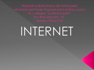Internet es una red global que conecta computadoras y permite el intercambio de información, surgió en 1969 con el proyecto militar ARPANET. Su historia se relaciona con el desarrollo de redes de comunicación y ahora es de uso universal y accesible, ofreciendo una gran variedad de servicios. Aunque tiene ventajas como el fácil acceso a información y comunicación, también presenta desventajas como la piratería y la proliferación de contenido inapropiado.