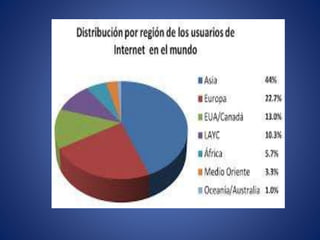 Internet es una red descentralizada de redes interconectadas que utiliza el protocolo TCP/IP. Se originó en 1969 con la conexión de las primeras computadoras en universidades de California y Utah. Uno de sus servicios más exitosos ha sido la World Wide Web (WWW), la cual permite consultar archivos de forma remota e hipertextual de manera sencilla. Internet tiene un profundo impacto social al romper barreras físicas y permitir la descentralización y acceso global a la información, aunque su uso sigue siendo desigual entre países y regiones.