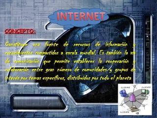 En la actualidades una enorme red que conecta redes y computadoras distribuidas por todo el mundo, permitiéndonos comunicarnos y buscar y transferir información sin grandes requerimientos tecnológicos ni económicos relativos para el individuo.
