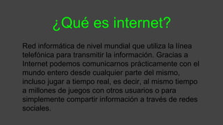El documento describe los fundamentos de Internet. Explica que Internet es una red mundial que usa líneas telefónicas para transmitir información, permitiendo la comunicación global y el acceso a servicios como juegos en línea y redes sociales. Brevemente describe la evolución histórica de Internet desde 1969 y el crecimiento exponencial de usuarios y servicios en línea. También resume los principales protocolos y tecnologías subyacentes como HTML, navegadores, servidores, HTTP, URL, IP y DNS que hacen posible que la información viaje por