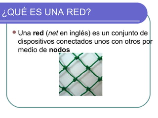 Este documento explica conceptos básicos sobre redes e Internet. Define una red como un conjunto de dispositivos conectados por nodos, y una red de ordenadores como una red donde los nodos ejercen cierto control. Describe el hardware necesario para conectarse a una red, incluyendo tarjetas de red, switches y routers. También explica direcciones IP, puertas de enlace, firewalls, modems y el proceso de enrutado de paquetes a través de Internet.