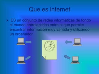 Internet es un conjunto de redes informáticas interconectadas a nivel mundial que permite acceder a una gran cantidad de información desde cualquier ordenador. Ofrece servicios como correo electrónico, web y transferencia de archivos que facilitan la comunicación y el acceso a la información desde casa sin horarios fijos. Aunque también plantea problemas como la presencia de hackers, virus y contenidos no deseados. Para conectarse se requiere de un ordenador con módem, una línea telefónica y un proveedor de servicios de internet.