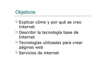 Internet surgió en 1969 como una red militar llamada ARPANET. Actualmente es una red global de redes que conecta millones de dispositivos a través de protocolos como TCP/IP. Ofrece servicios como correo electrónico, web, motores de búsqueda y aplicaciones para compartir archivos y chatear. Su arquitectura descentralizada y protocolos abiertos han permitido su rápido crecimiento.