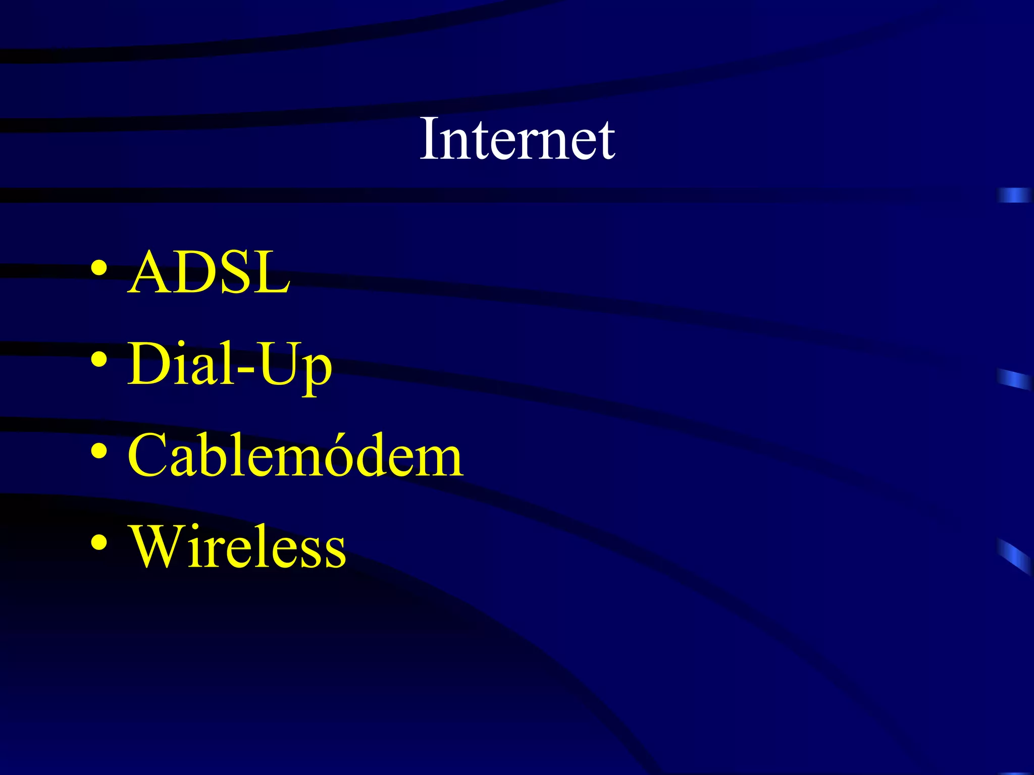 El documento resume diferentes tipos de conexión a Internet, incluyendo ADSL, cablemódem, dial-up y wireless. ADSL usa líneas telefónicas para proporcionar una conexión de alta velocidad bidireccional asimétrica. El cablemódem usa la infraestructura de cable existente pero tiene un ancho de banda compartido. La conexión dial-up es más lenta pero sólo se paga por el uso. La conexión wireless permite flexibilidad y fácil instalación sin cables.