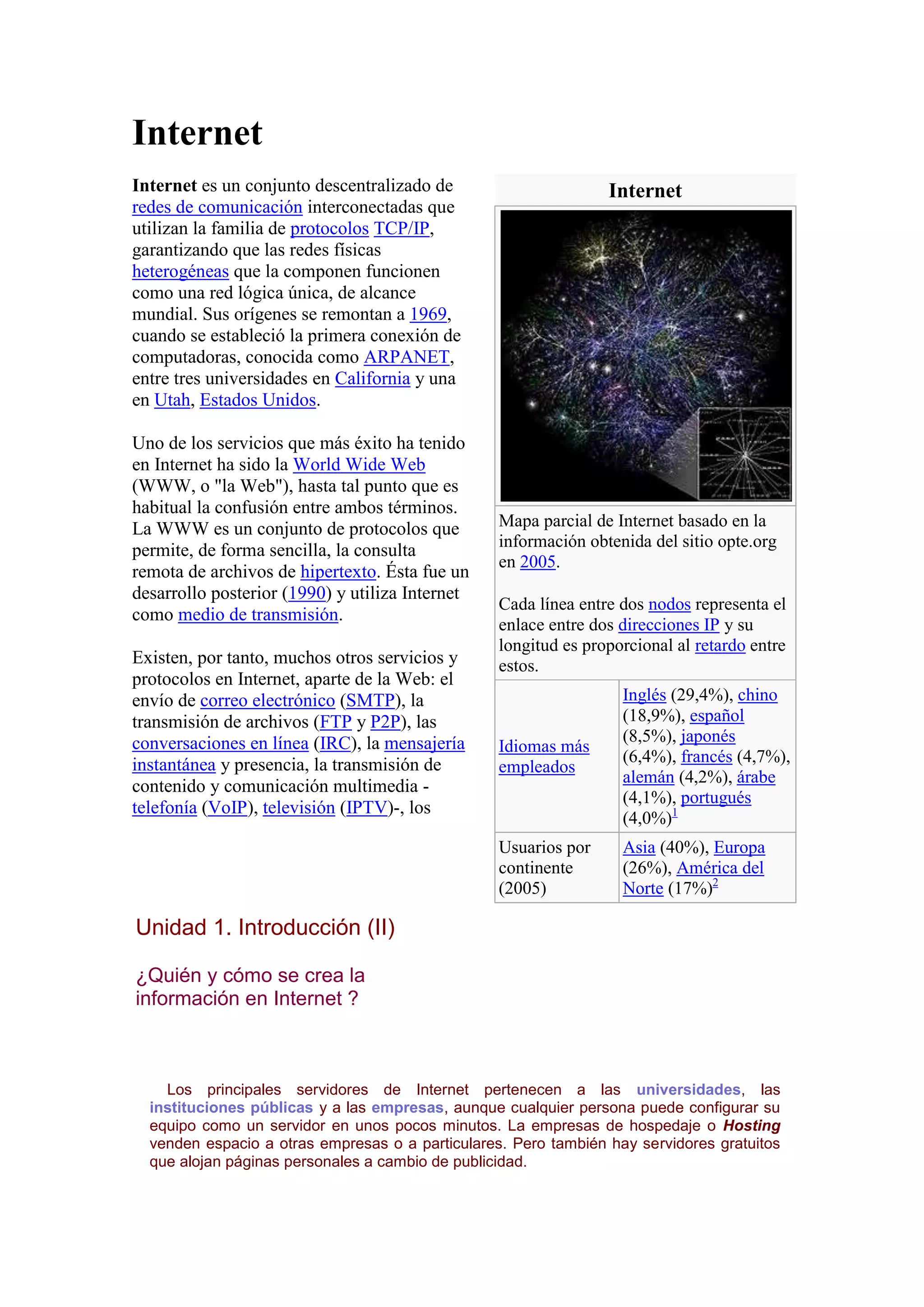 El documento habla sobre Internet. Explica que Internet es una red descentralizada de redes interconectadas que usan protocolos TCP/IP para funcionar como una red lógica única a nivel mundial. También describe algunos servicios populares en Internet como la World Wide Web y cómo se crea y comparte información entre usuarios, empresas y otras entidades.