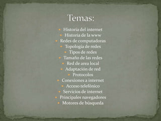 El documento describe brevemente la historia de Internet y la World Wide Web, incluyendo los conceptos iniciales desarrollados por Vannevar Bush, J.C.R. Licklider y Tim Berners-Lee. También cubre temas como tipos de redes, topologías de redes, protocolos, conexiones a Internet y servicios comunes como navegadores y motores de búsqueda.