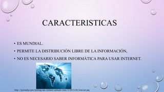 El documento describe las características básicas de Internet. Internet es una red global que une todas las redes compatibles entre sí permitiendo la distribución libre de información para su uso por cualquier persona sin necesidad de conocimientos avanzados de informática.
