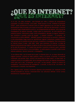 La Internet es una red mundial de computadoras conectadas que permite el acceso y compartir de información. Se originó a finales de los 1960 en el Departamento de Defensa de EE.UU. como el proyecto ARPANET para permitir la comunicación entre computadoras ubicadas en lugares distantes. En los 1990s se hizo popular y accesible al público con la invención del modem y la World Wide Web, lo que permitió la publicación y descarga fácil de archivos multimedia como video y texto. Hoy en día es una importante fuente de comunicación y consulta a través de