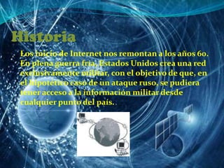 Internet comenzó en la década de 1960 como una red militar estadounidense llamada ARPANET que conectaba cuatro universidades, y creció rápidamente a 40 ordenadores en dos años. En la década de 1980, el protocolo TCP/IP se convirtió en el estándar y la red ya tenía miles de servidores, aunque seguía siendo principalmente textual. En 1993, el navegador Mosaic introdujo una interfaz gráfica que hizo Internet accesible para el público general.