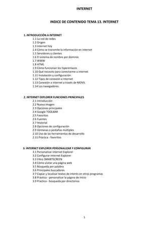 Este documento proporciona una introducción general a Internet. Explica que Internet se originó en la década de 1960 como una red de comunicaciones financiada por el gobierno de los Estados Unidos llamada ARPANET. También describe cómo Internet ha evolucionado desde entonces para convertirse en una red global masiva que conecta millones de computadoras y permite compartir información. Finalmente, resume el impacto social y económico que Internet ha tenido al revolucionar la forma en que las personas acceden a la información y se comunican.