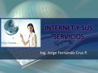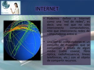 Internet es una red de redes que interconecta computadoras y redes de computadoras. Para conectarse a Internet se requiere un contrato con un proveedor, conexión física y lógica, y aplicaciones como navegadores web. Existen diferentes tipos de conexión como RTC, RDSI, ADSL, cable e internet vía satélite. Los navegadores permiten visualizar páginas web y otros formatos de documentos de Internet. Los dominios y buscadores son herramientas clave para navegar e identificar recursos en la red.