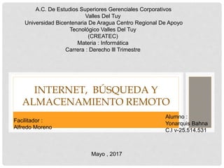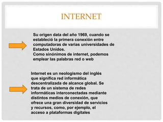 Este documento trata sobre Internet, la búsqueda de información y el almacenamiento remoto. Explica que Internet es una red global descentralizada que ofrece diversos servicios y recursos. También describe diferentes formas de conectarse a Internet y diferentes motores de búsqueda como Google, Yahoo y Bing. Finalmente, discute sobre el almacenamiento remoto de datos en la nube y ejemplos como Dropbox y Google Drive.