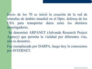 El documento resume la historia del desarrollo de Internet. Comenzó en la década de 1970 como una red de computadoras llamada ARPANET creada por el Departamento de Defensa de EE.UU. para permitir el intercambio de datos entre investigadores. Más tarde fue reemplazada por DARPA y evolucionó hasta lo que hoy conocemos como Internet, una red mundial de redes de computadoras que permite la comunicación y difusión de información.