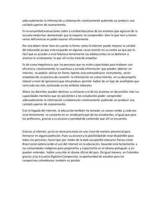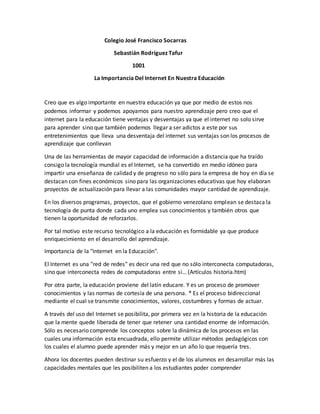 El documento discute la importancia del Internet en la educación. Señala que el Internet proporciona una gran cantidad de información y herramientas para apoyar el aprendizaje, pero también puede conducir a la adicción. El Internet ha permitido nuevos métodos de enseñanza que son más efectivos y desarrollan mejor las habilidades de razonamiento. Sin embargo, es importante que los estudiantes aprendan a analizar y comprender críticamente la información en línea.