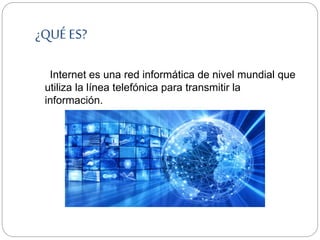 Internet nació como un proyecto militar estadounidense en la década de 1970 para garantizar las comunicaciones en caso de ataque nuclear. Se ha convertido en una red informática global que conecta computadoras y dispositivos para compartir información a través de páginas web, correo electrónico, chat y otros servicios. Actualmente es una herramienta esencial utilizada por miles de millones de personas diariamente.