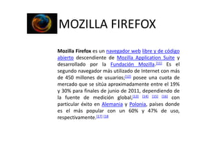 El documento describe varios navegadores web populares como Mozilla Firefox, Safari, Opera, Internet Explorer, Google Chrome, Flock y KidZui. Cada navegador tiene características únicas como navegación por pestañas en Safari, motor de renderizado WebKit en Chrome y Flock, y contenido para niños en KidZui.