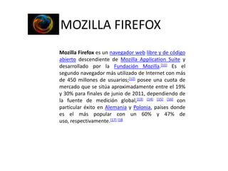 El documento describe varios navegadores web populares como Mozilla Firefox, Safari, Opera, Internet Explorer, Google Chrome, Flock y KidZui. Cada navegador tiene características únicas como navegación por pestañas en Safari, motor de renderizado WebKit en Chrome y Flock, y contenido para niños en KidZui.
