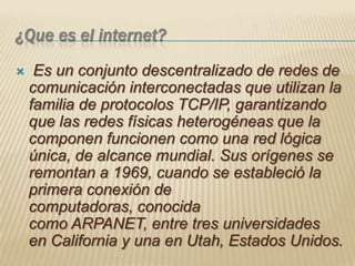 El documento define Internet como una red descentralizada de redes interconectadas que usan protocolos TCP/IP para funcionar como una red lógica global. Explica que su origen fue ARPANET en 1969 y que la World Wide Web fue un desarrollo posterior en 1990 que usa Internet para transmitir archivos hipertextuales. También resume brevemente la historia de Internet desde su creación por ARPA en los 1960 hasta su evolución en una red global privada interconectada hoy en día.