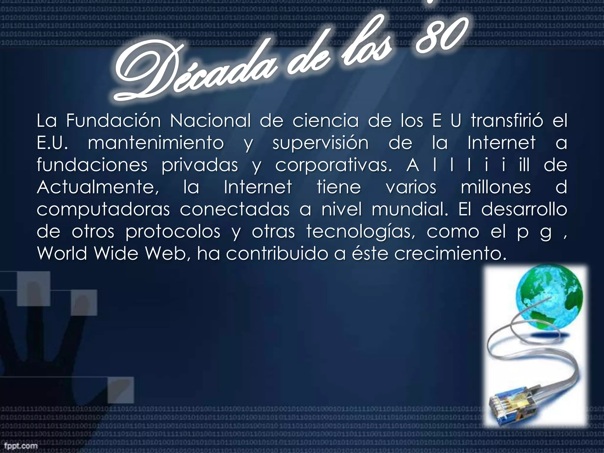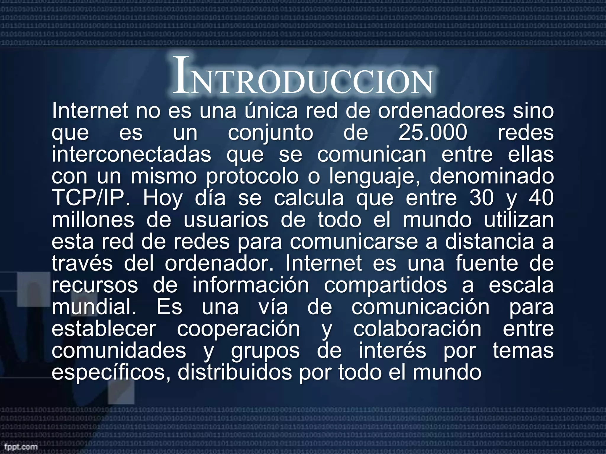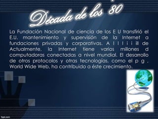 Este documento proporciona una historia del desarrollo de Internet. Comenzó en la década de 1960 como una red militar llamada ARPANET que conectaba cuatro supercomputadoras. En la década de 1970, se desarrollaron los protocolos TCP/IP y más instituciones educativas y de investigación se conectaron a ARPANET. En la década de 1980, la red creció rápidamente y se convirtió en una red mundial descentralizada conocida como Internet.