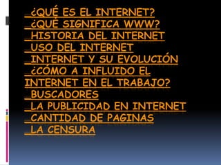 El documento resume la historia, uso y evolución de Internet. Comenzó en 1969 como ARPANET, una red de comunicaciones entre universidades estadounidenses. Se ha vuelto un conjunto descentralizado de redes interconectadas que permite el acceso mundial a información. Su uso incluye descargas, correo electrónico, redes sociales y comercio. Ha influido en el trabajo al permitir la flexibilidad y trabajo remoto. Su evolución continúa con el crecimiento exponencial de usuarios y contenido disponible.
