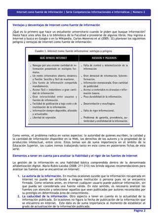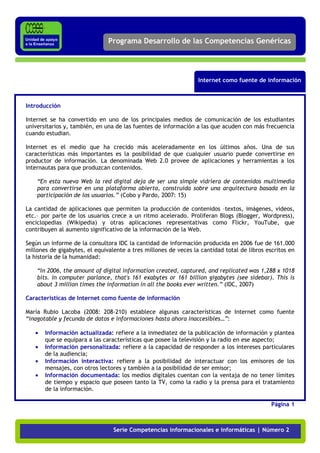 Internet se ha convertido en una de las principales fuentes de información para los estudiantes universitarios. Ofrece información actualizada, personalizada e interactiva. Sin embargo, plantea desafíos como la calidad y autoridad de la información, debido a que cualquier usuario puede publicar contenido. Para evaluar fuentes en Internet, es importante considerar la autoría, fecha, relevancia y tipo de información. Herramientas como RSS y etiquetado social pueden ayudar a clasificar y recuperar información de manera efectiva.
